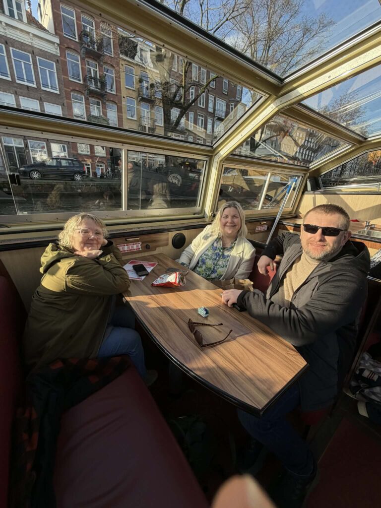 Etterpå ble det litt shopping og lunsj, før hele dagen ble rundet av med en båttur på kanalene. Og som om Amsterdam ville gi oss en gave: regnet ga seg, solen tittet frem, og byen viste seg fra sin aller beste side 🌞